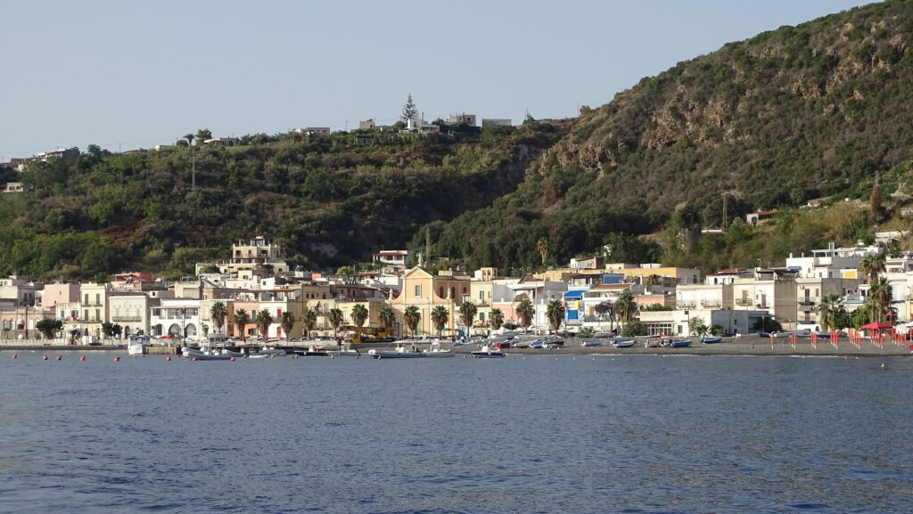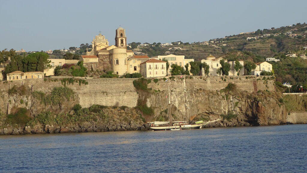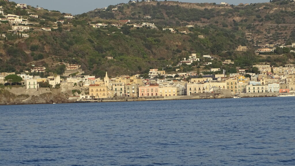 In der Straße von Messina zwischen Sizilien und dem Stiefel strömt es zweimal am Tag nur relativ kurz in unserer Richtung, aber wir trafen den richtigen Zeitpunkt, ohne dass der Wind zunahm machten wir immer mehr Fahrt. Bis auf 6kn kamen wir, doch dann fuhren wir in einen Strudel und es ging runter bis 2kn, aber zur Seite. Es war schon dunkel als wir die Straße von Messina verließen und Moana Richtung Lipari schlich. Zum Schluss musste noch der Motor helfen. Bei aufgehender Sonne lag Lipari vor uns, ein herrlicher Anblick, nur einen guten Ankerplatz fanden wir nicht, zu tief, zu dicht am Ufer, Riff oder anderen Booten. Eine Bucht nördlich, im Süden von Canneto fanden wir dann einen passenden Ankerplatz.