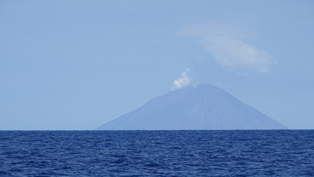 Am 9.September morgens starteten wir Richtung Liparische Inseln. Anfangs war das Ionische Meer bei gutem Wind recht ruppig, Moana stampfte ordentlich, aber der Wind ließ schnell nach. Der Ätna auf Sizilien war schon gut zu sehen, nur näher kommen wollte er nicht, wir machten nur 2-3kn Fahrt.