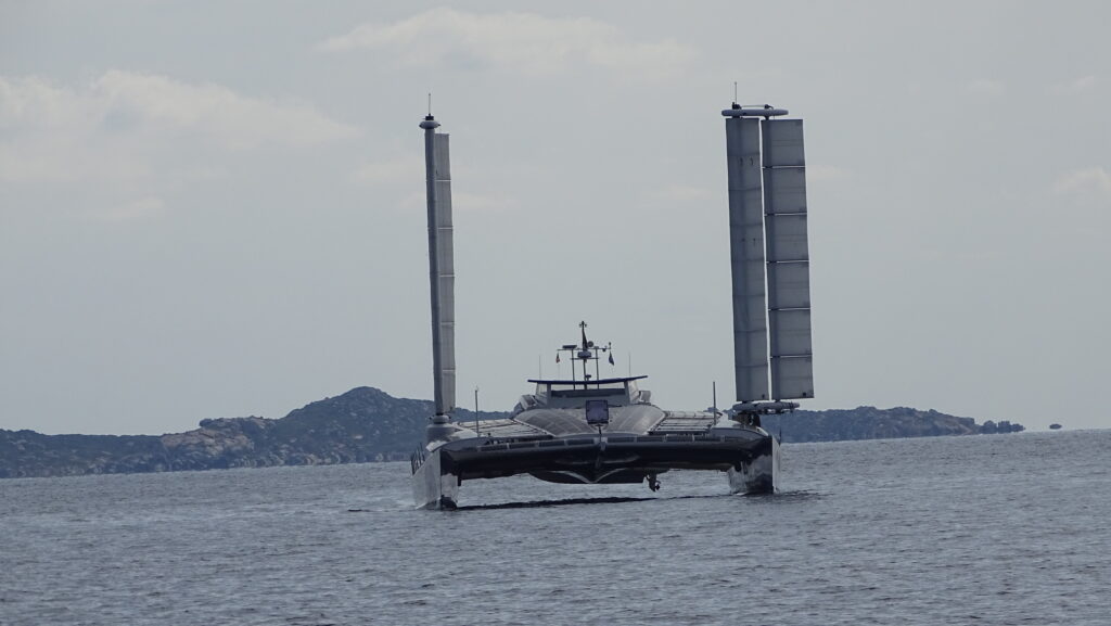 vor Cagliari, ein französischer Katamaran mit festen Segelnsüdlich um Sardinien nach Carloforte